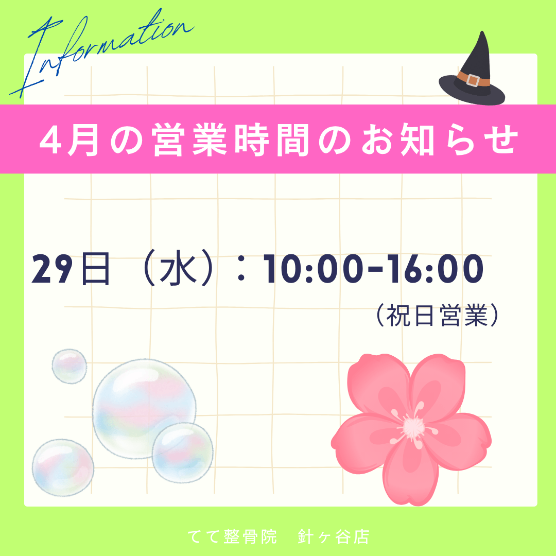 【4月の営業時間】 4月29日(水):昭和の日(10:00-16:00)