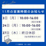 こんにちは!てて整骨院針ヶ谷院です。 11月の営業時間に関してご連絡いたします! 〜・〜・〜・〜・〜 3日(月・祝) 10:00~16:30 ※祝日のため、短縮営業※ 24日(月・祝) 10:00~16:30 ※祝日のた […]